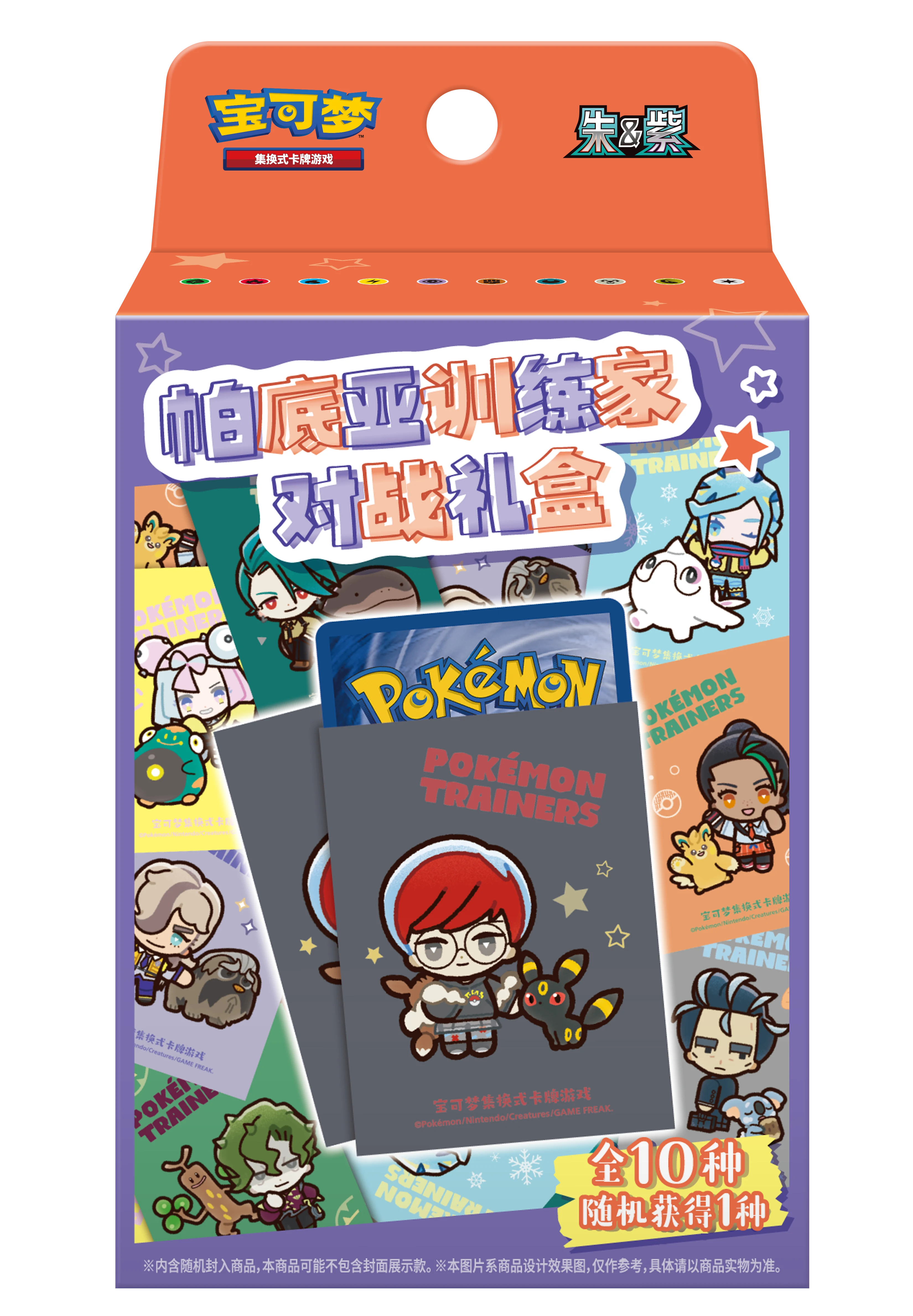 帕底亚训练家对战礼盒内含1套随机帕底亚训练家主题艺术卡套,以及1张对应的训练家闪卡。艺术卡套上绘制了卡通风格的训练家和宝可梦形象,萌趣可爱,生动传神。试着看看你能获得哪一款吧!