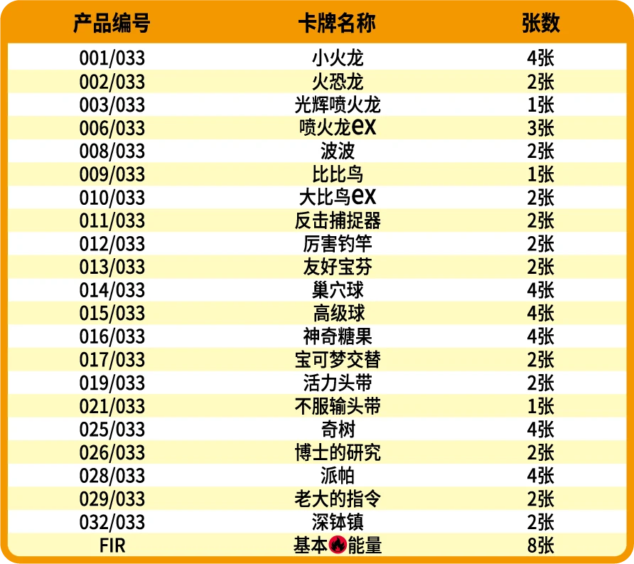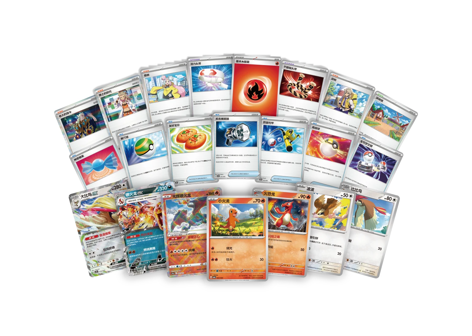 | 商品内容 | 1. 喷火龙ex卡组(60张) 1套 2. 喷火龙ex卡组改造包(15张) 1包 3. 利刃猛醒 补充包(20张) 4包 4. 随机对战艺术卡套(64张) 1套(全8种,每种等比生产,随机封入1种) 5. 喷火龙主题卡组收纳盒(含2块隔板) 1个 6. 硬币骰子 1个 7. 伤害指示物骰子 6个 8. VSTAR标记 1个 9. 灼伤标记 1个 10. 中毒标记 1个 11. 喷火龙ex卡组基本运营战略 1张 12. 喷火龙ex卡组改造指南 1张 |