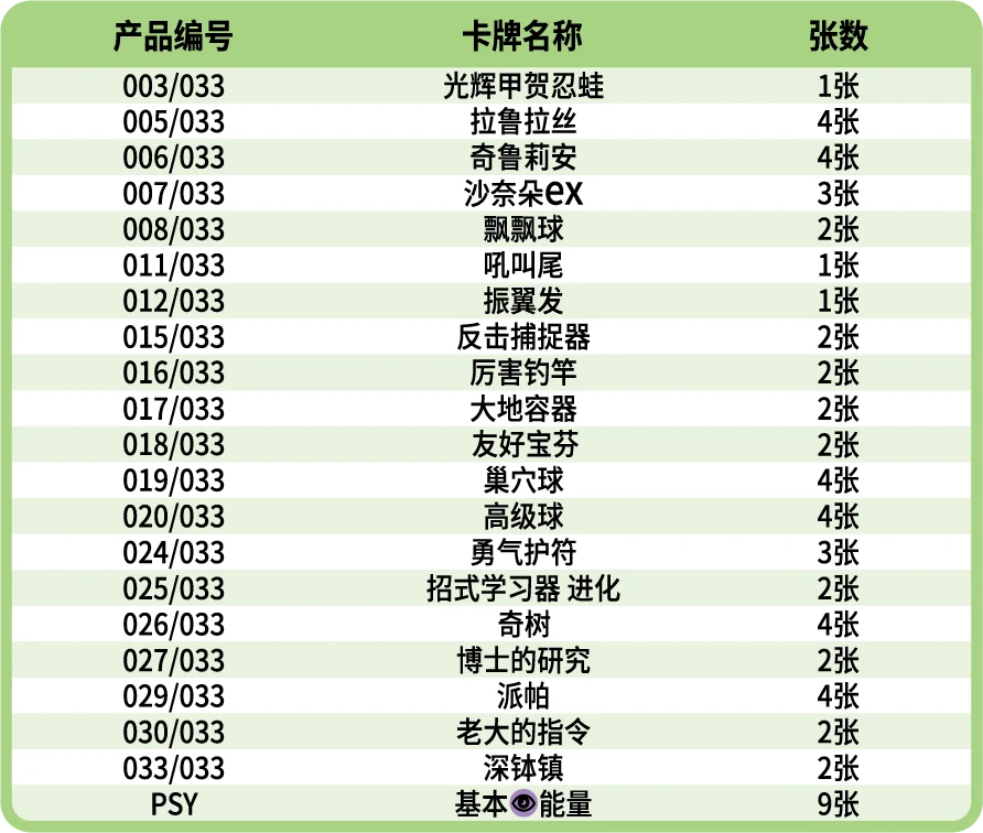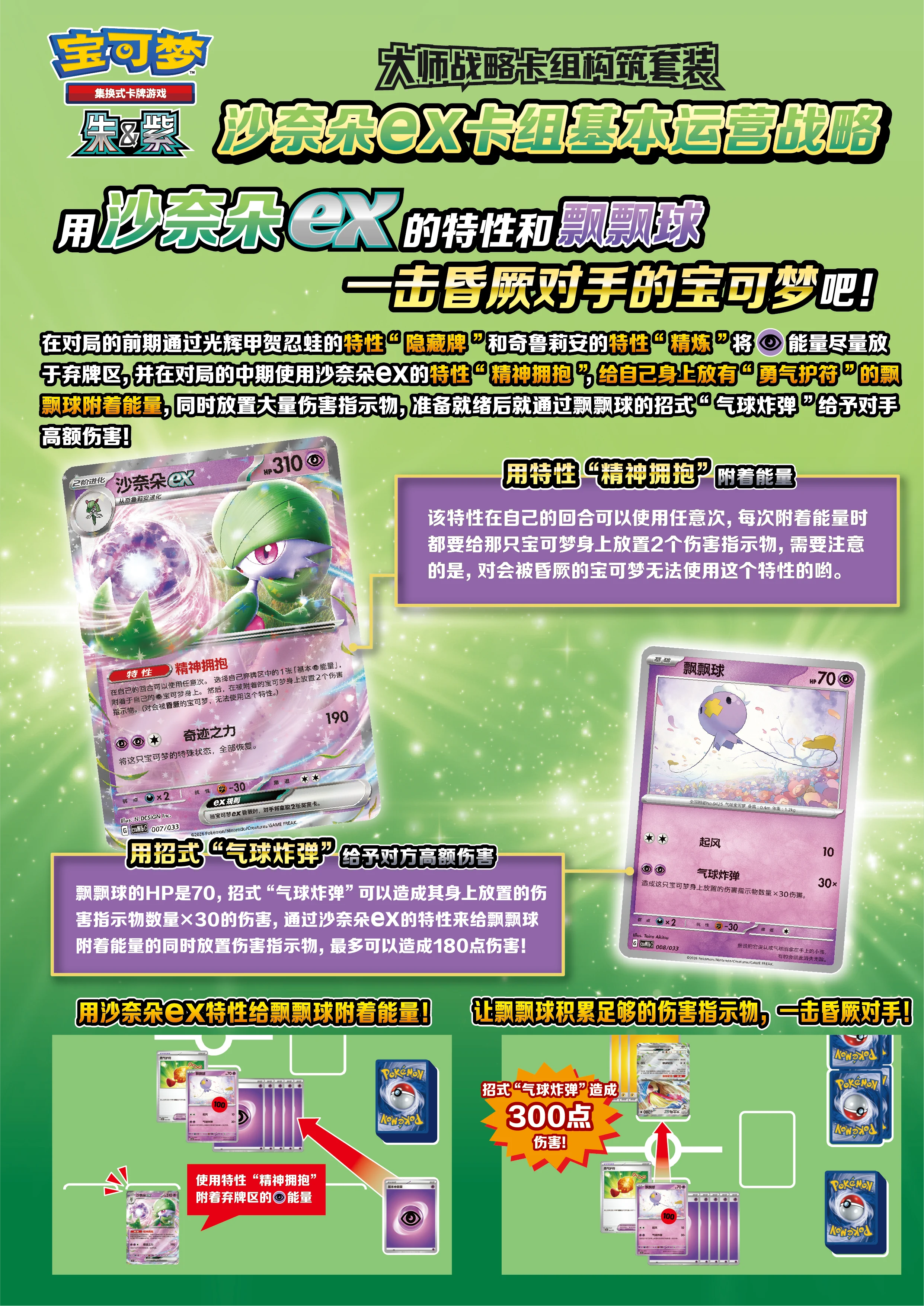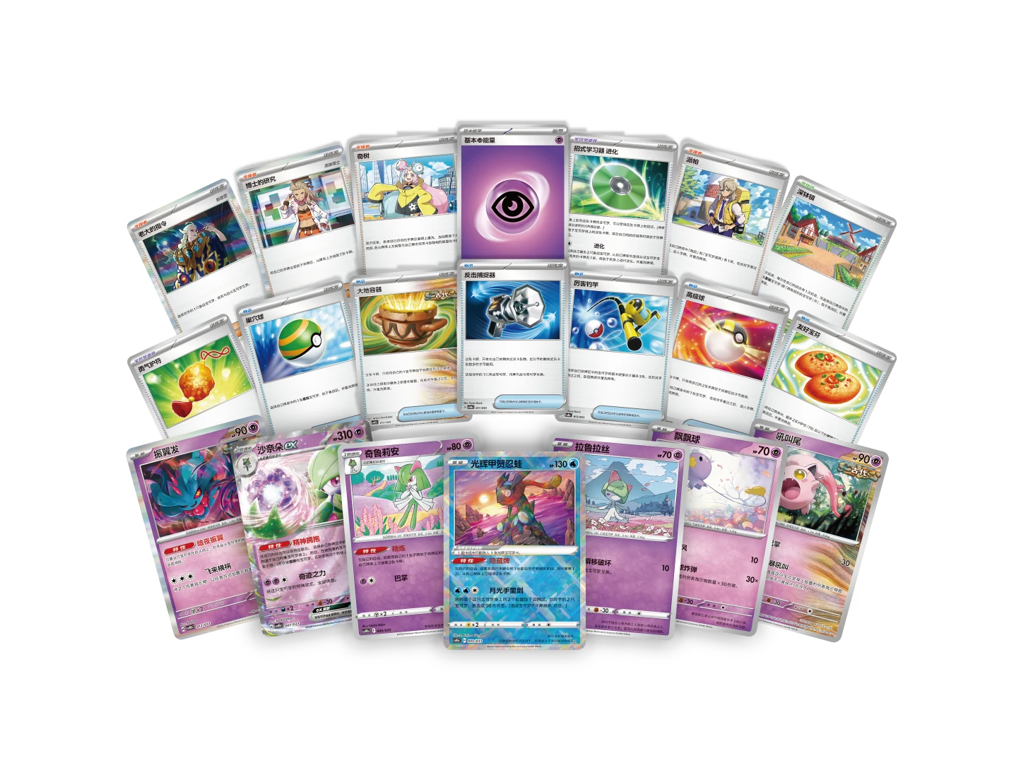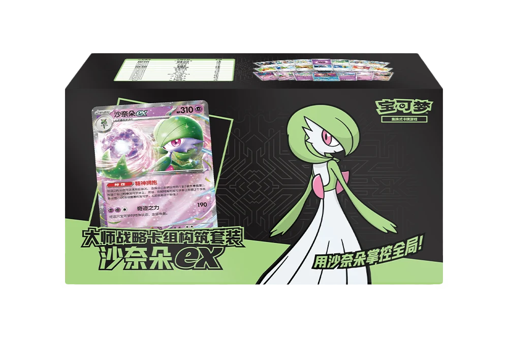 沙奈朵ex款大师战略卡组构筑套装收录了一套精心构筑的沙奈朵ex卡组。卡组内不仅有沙奈朵ex、飘飘球、光辉甲贺忍蛙等强力宝可梦卡,还有奇树、友好宝芬、大地容器等实用的训练家卡。如果你喜欢用精密的谋划和深远的战术步步为营、掌控战局,那沙奈朵ex卡组就是你最值得信任的搭档。
