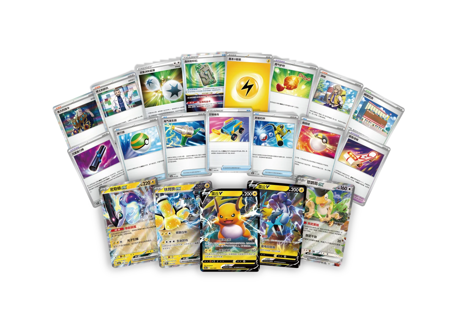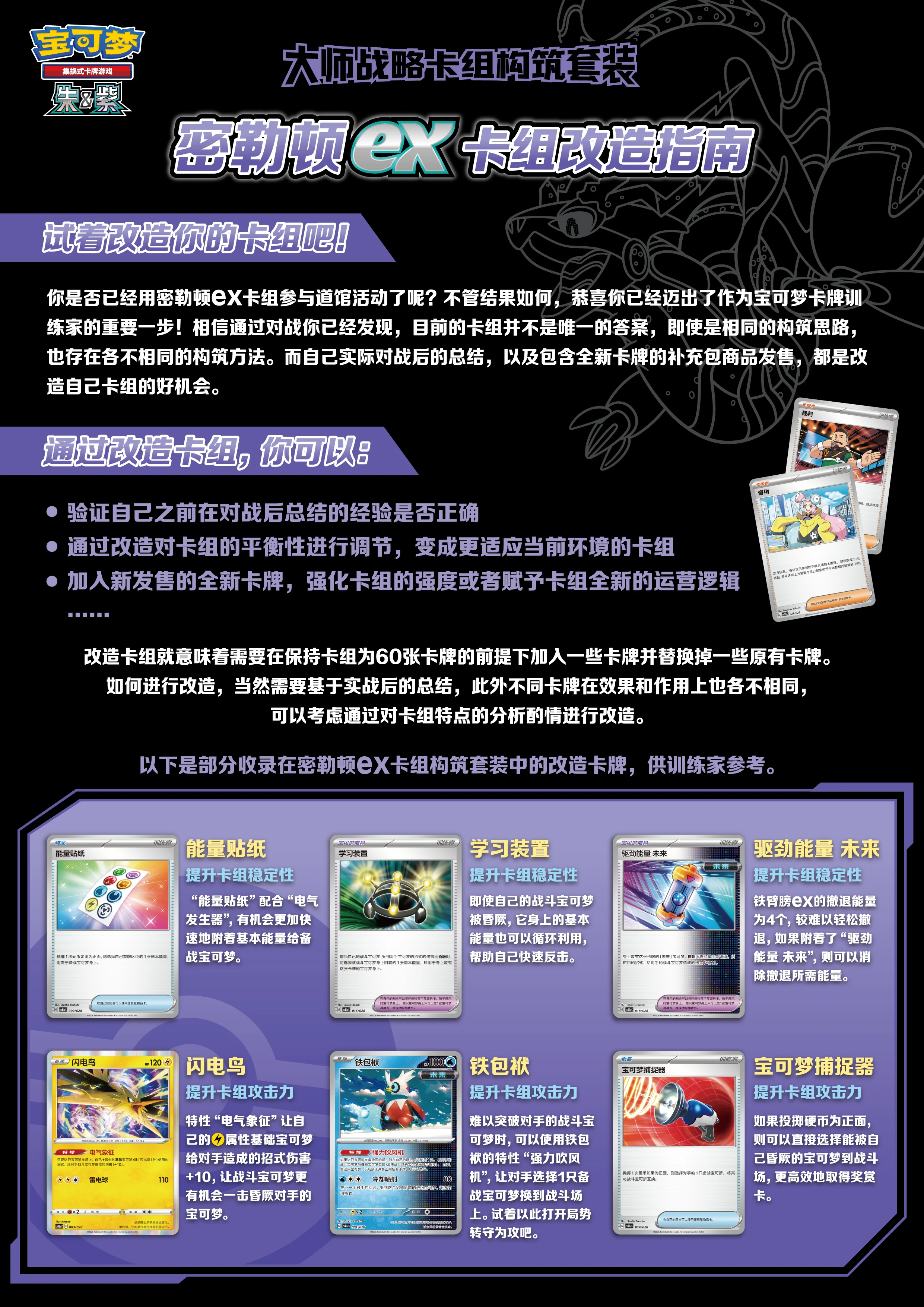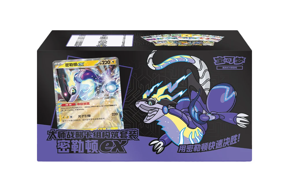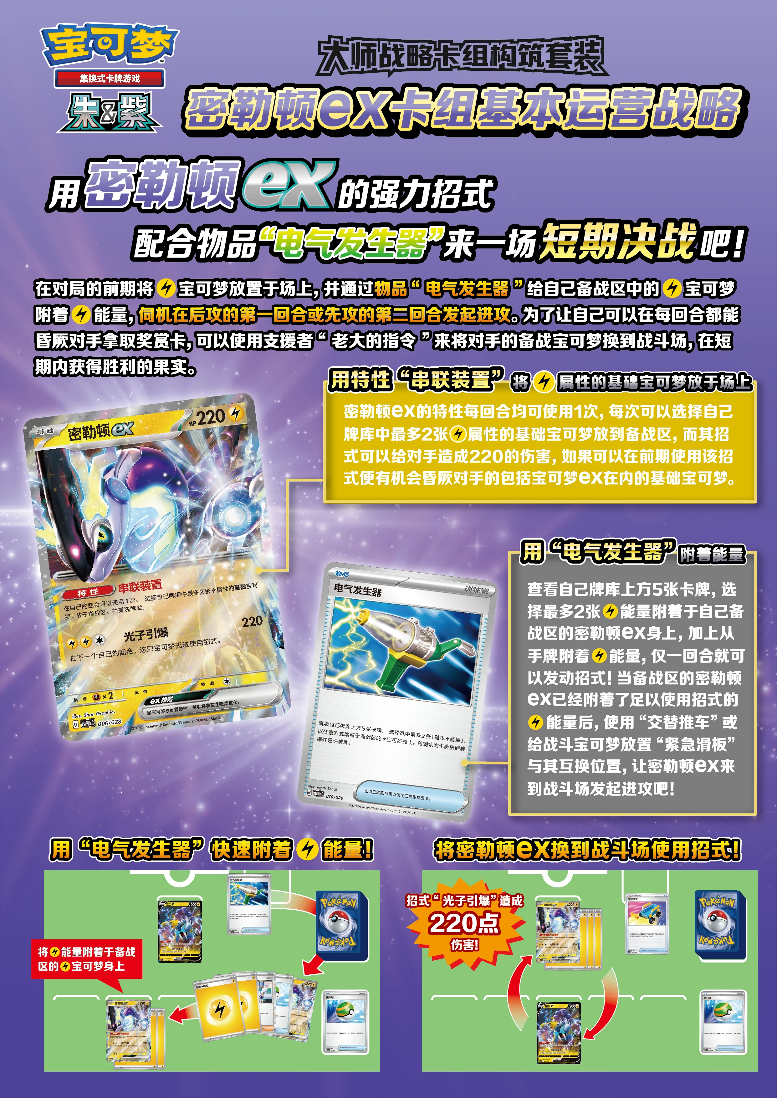 密勒顿ex款大师战略卡组构筑套装收录了一套精心构筑的密勒顿ex卡组。卡组内不仅有密勒顿ex、铁臂膀ex、雷公V等强力宝可梦卡,还有电气发生器、紧急滑板、森林封印石等实用的训练家卡。如果你相信唯快不破,决定以迅雷不及掩耳之势击溃对手,那就不要犹豫,选择密勒顿ex卡组。