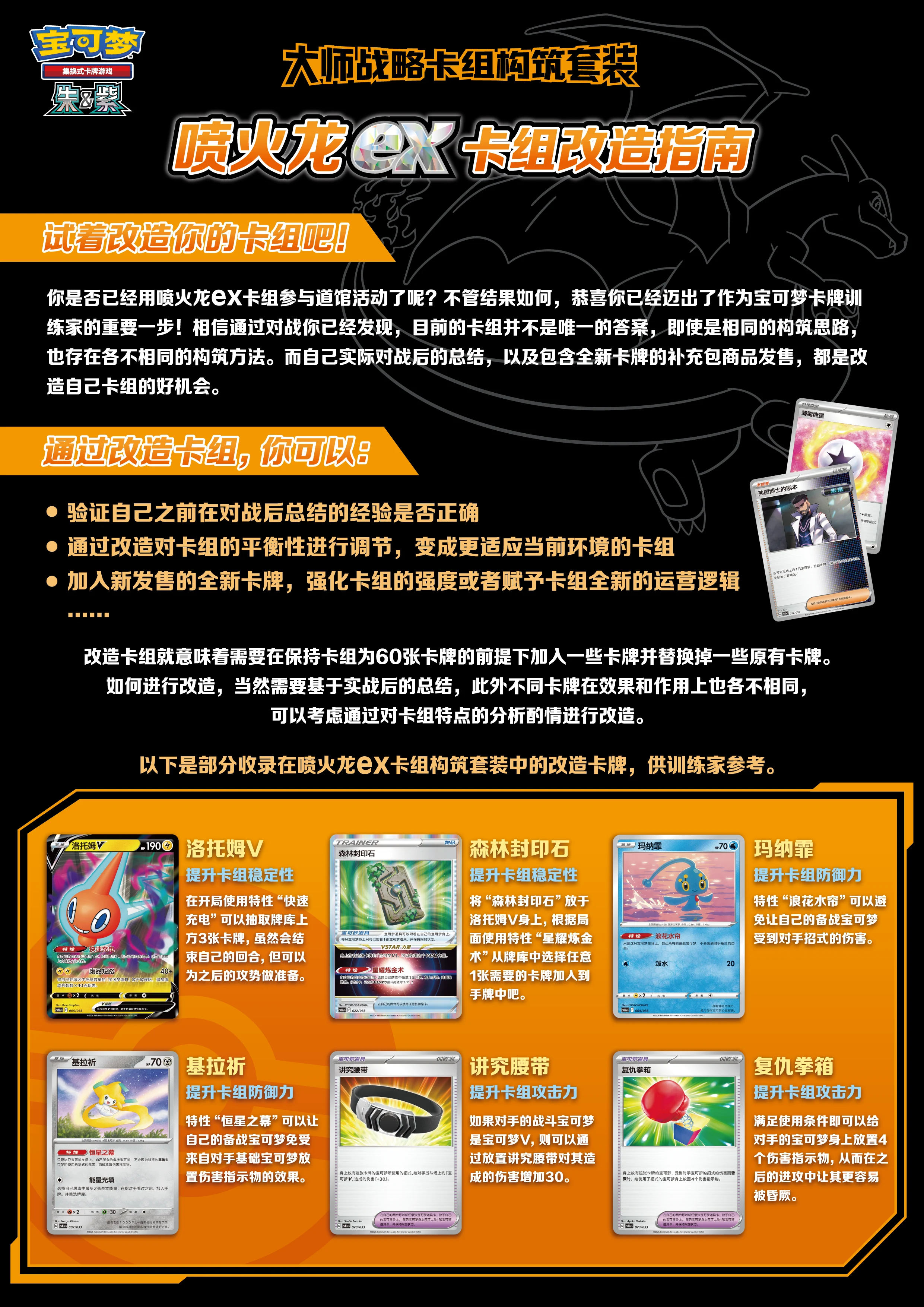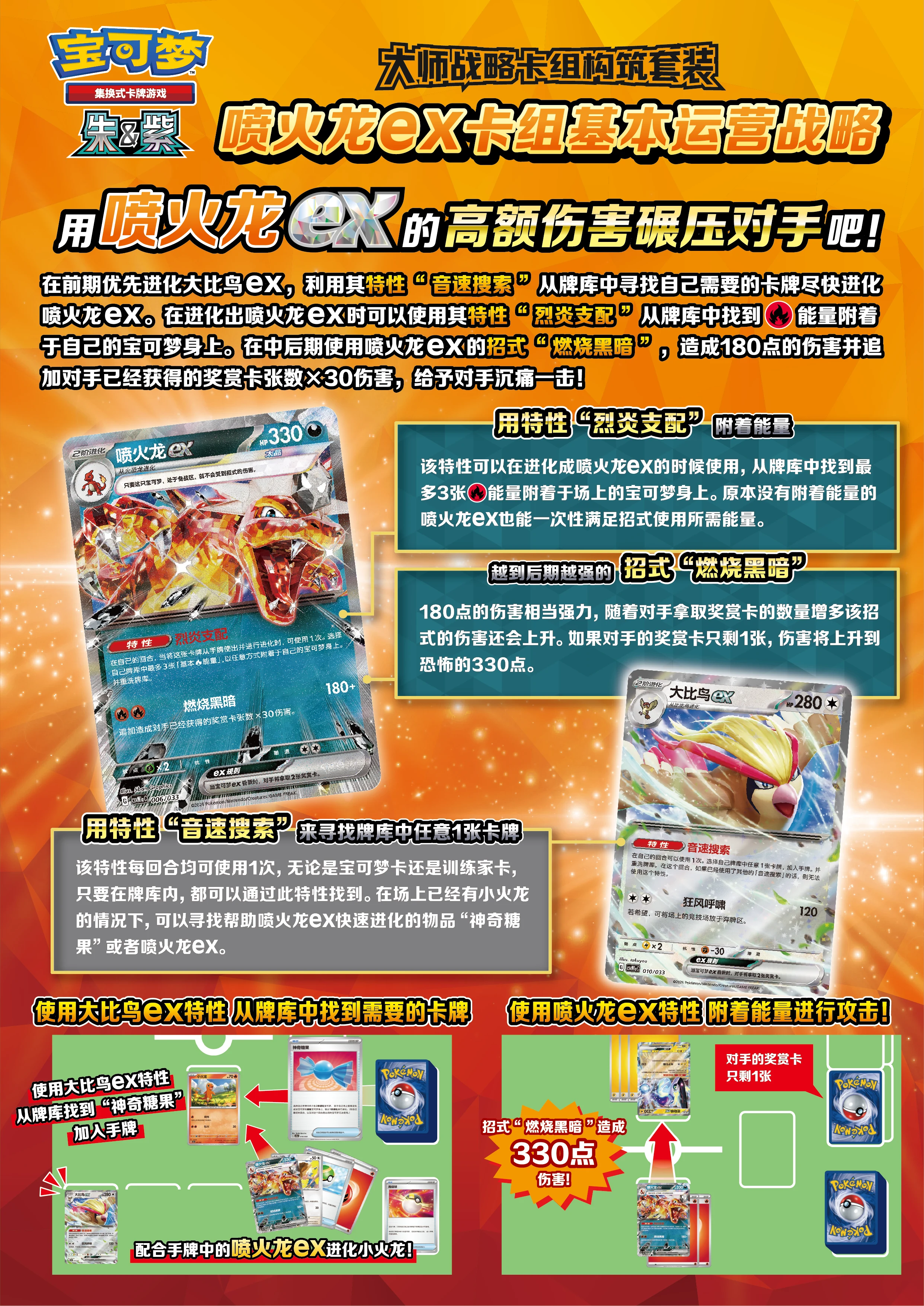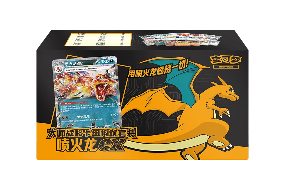 喷火龙ex款大师战略卡组构筑套装收录了一套精心构筑的喷火龙ex卡组。卡组内不仅有喷火龙ex、大比鸟ex、光辉喷火龙等强力宝可梦卡,还有派帕、友好宝芬、反击捕捉器等实用的训练家卡。如果你享受用高额的伤害绝地反击、一击制胜,喷火龙ex卡组就是你的不二之选。