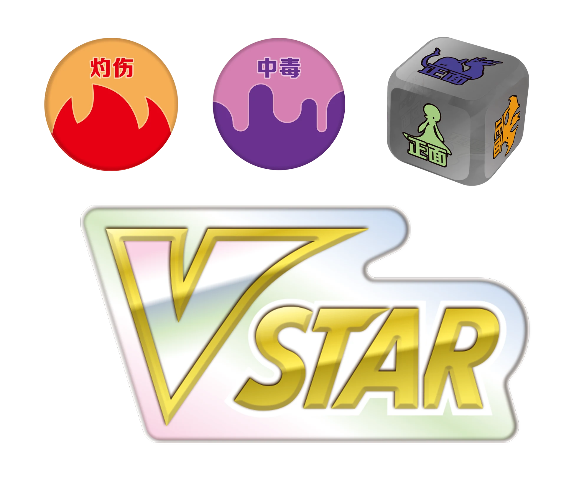 以及绘制了喷火龙、沙奈朵、密勒顿剪影的精美硬币骰子,金属伤害指示物骰子,和亚克力材质的VSTAR标记,中毒、灼伤标记。
